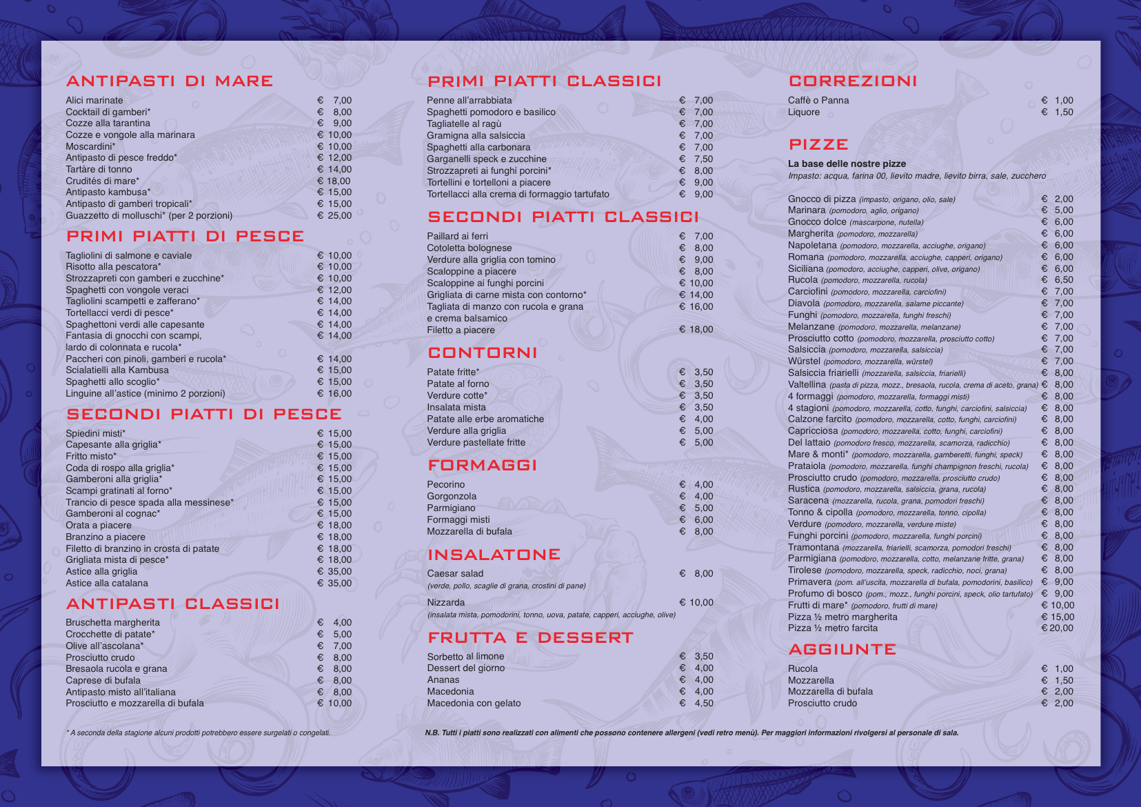 - Menu fisso a soli 13,00 Euro comprendente una pizza a scelta, una bibita e un caffè (coperto incluso)